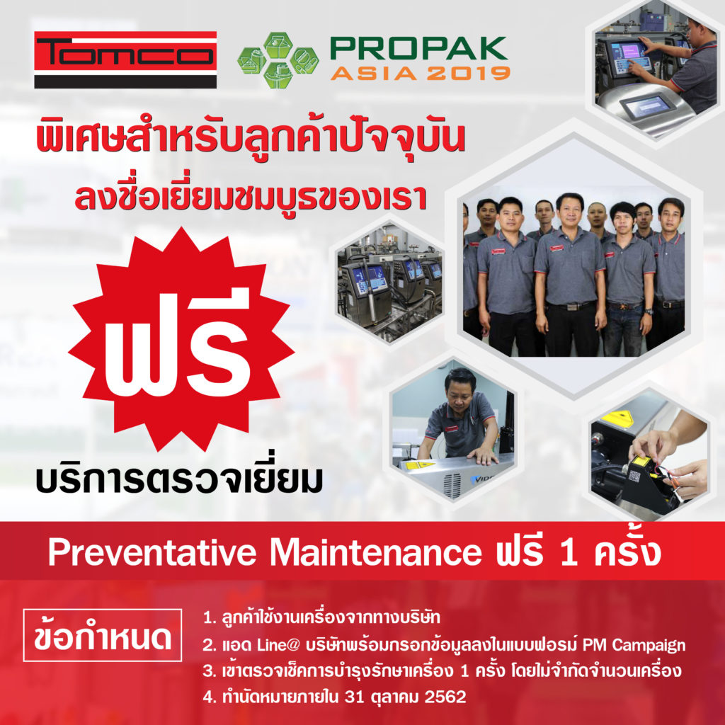 **กรณีนี้ทางลูกค้าใช้งานเครื่อง Videojet อยู่แล้วเมื่อลูกค้ามาเยี่ยมชมบูธทอมโก้ เพียงแอดไลน์บริษัท พร้อมกรอกข้อมูลลงในแบบฟอร์ม PM Campaign รับทันทีการเข้าตรวจเช็คการบำรุงรักษาเครื่อง 1 ครั้ง โดยไม่จำกัดจำนวนเครื่อง
